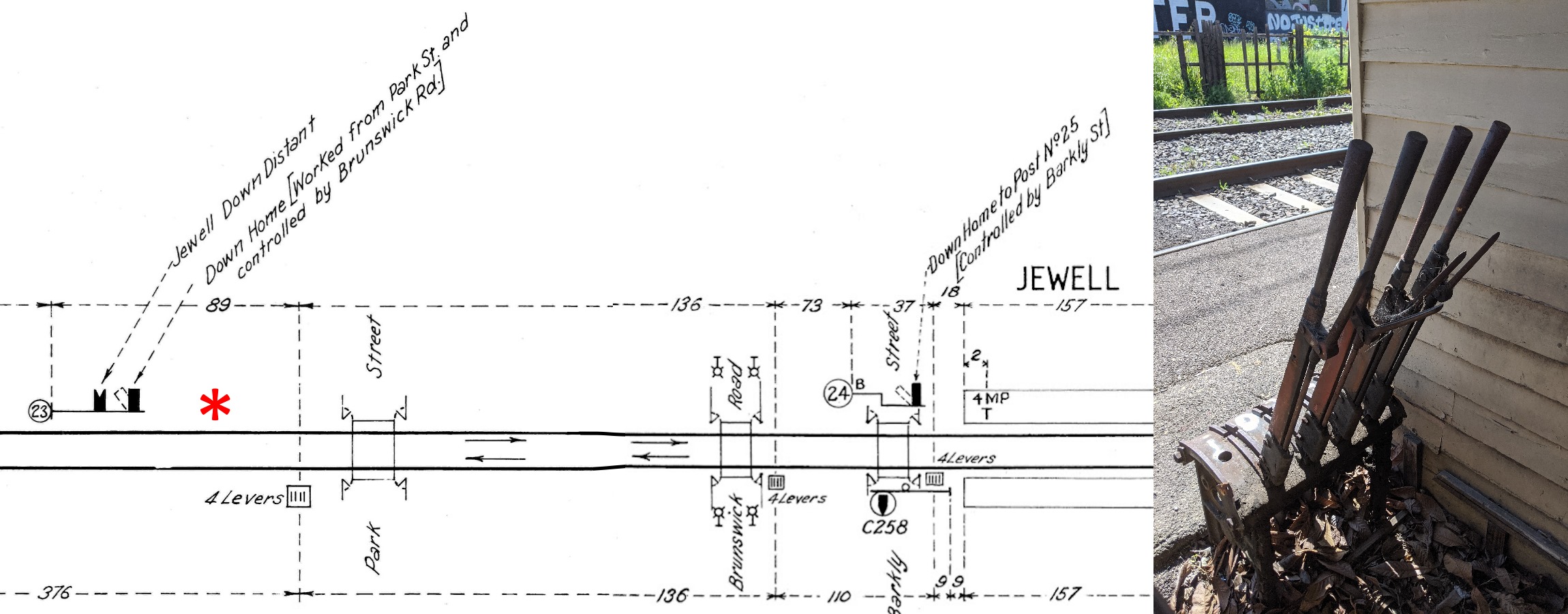 Diagram showing where posts 23 and 24B were located in service. The red asterisk shows where post 24B is today. Right Photo: Levers at Brunswick Rd. Would've controlled Post 23 Down home and C258.